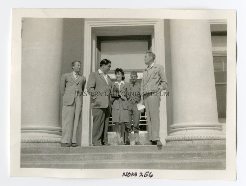 Exterior photograph of five people standing at the top of the courthouse steps in front of the front door to the Inyo County Courthouse in Independence, CA. Two of the people are identified as "The Howard Kumagis" applying for a marriage license, one man is identified as "Mervyn Kidwell, WCCA." Also present is an armed U.S. Army MP guard in uniform carrying a rifle.