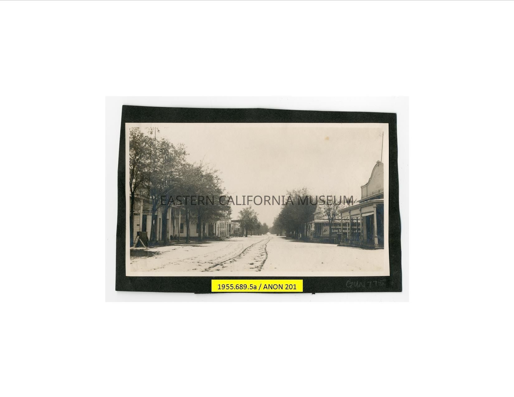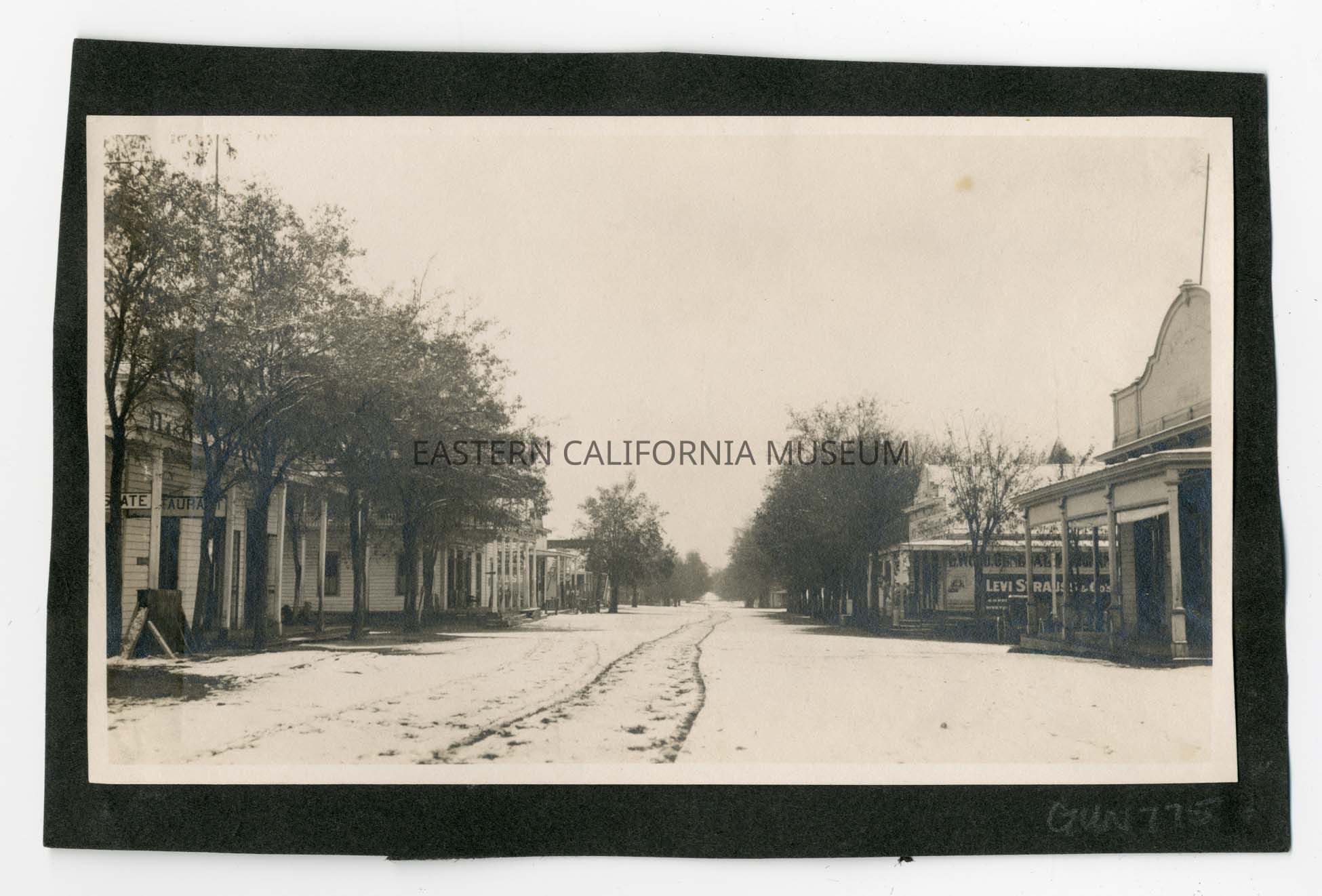 Photo taken looking down the main street (Edwards Street) in Independence after it snowed. Several businesses are visible including a restaurant, an advertisement for Levi Strauss & Co., and the Harris & Rhine store.Photograph Details