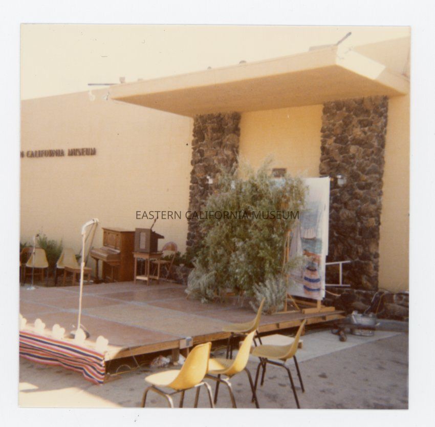 Color photo of a stage, backdrop, and chairs set up at the front entrance to the Eastern California Museum for the 1980 Museum Show.Collection