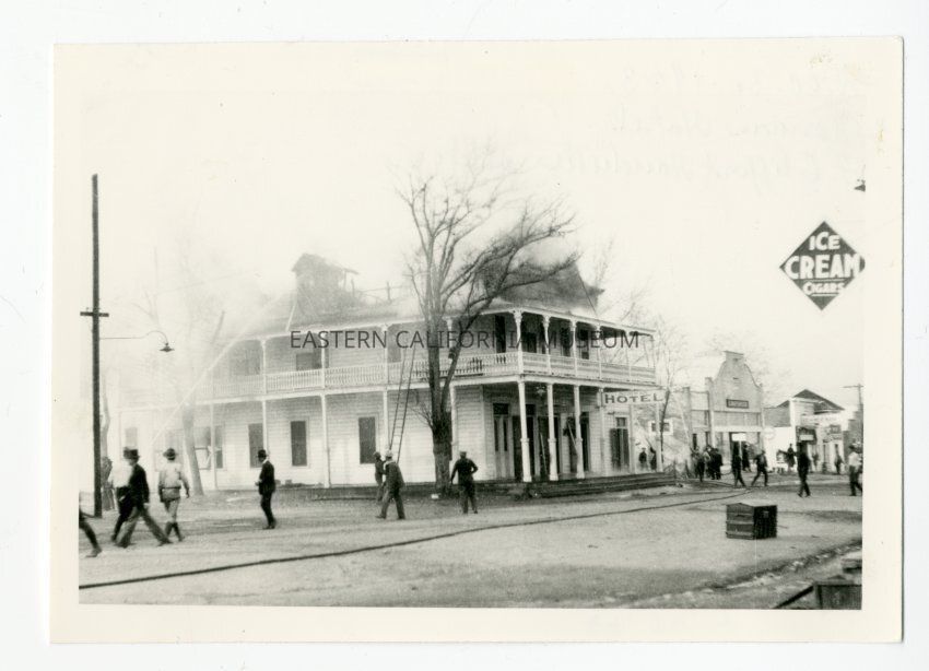Black and white photograph of the Norman Hotel in Independence on fire on December 30, 1923. This photo shows the smoke clearing so the chared remains of the top floor are visible. Water hoses and firefighters with ladders are visible. A sign is visible in the right hand side: "Ice Cream Cigars."Made/Created