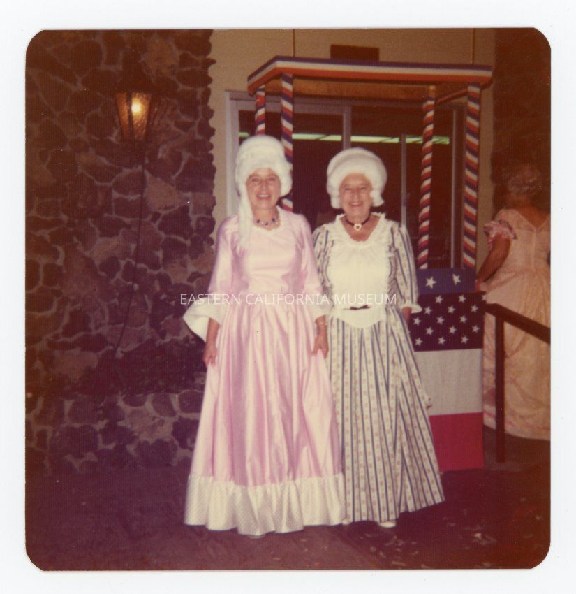 Color photo of two women dressed in American Colonial costumes in front of the front entrance of the Eastern California Museum. One of the women is Lena Sluyter.
