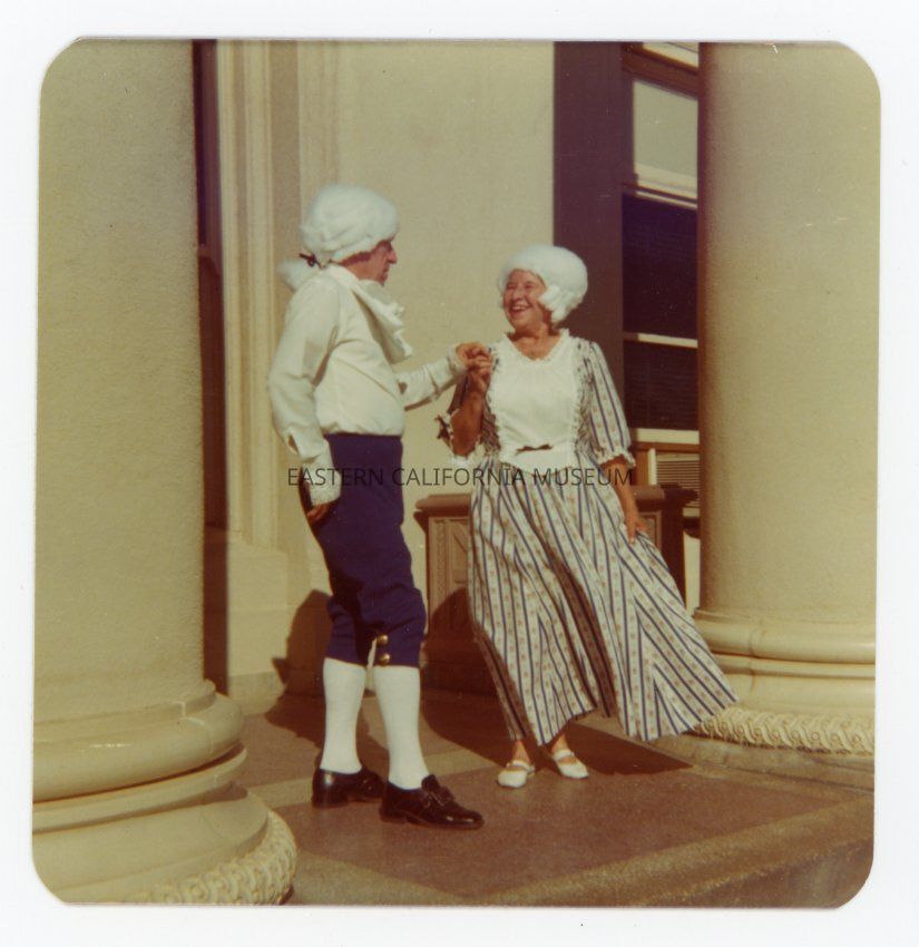 Color photo of Leonard and Lena Sluyter dressed in American Colonial costumes and dancing on the steps to the Inyo County Courthouse.