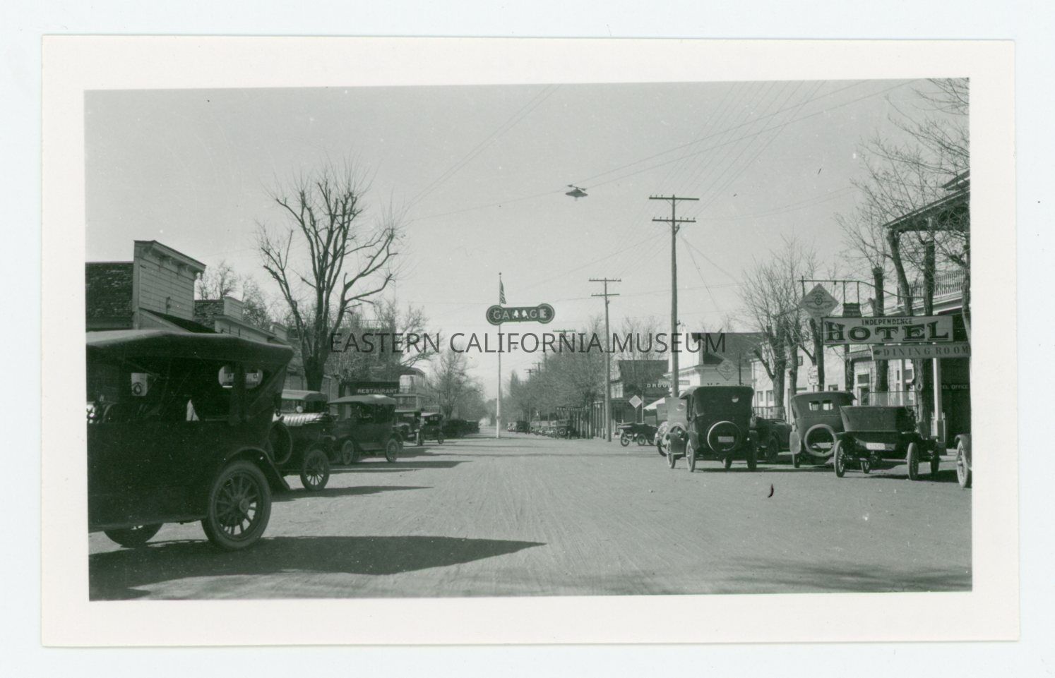 Copy of a photo of the main road through Independence (Edwards Street). The Independence Hotel is visible on on the right, a drug store and garage are visible further down. There is a restaurant on the left side and there are lots of vehicles parked along both sides of the street.