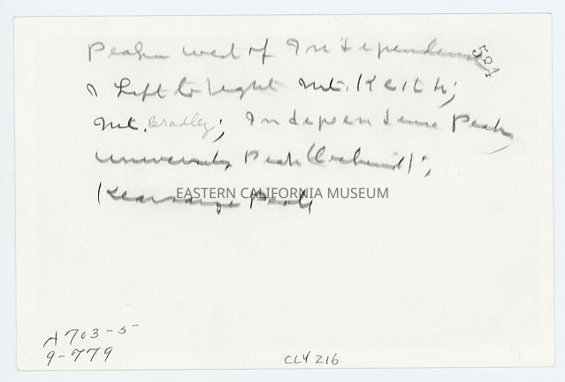Handwritten in pencil on reverse: Peaks west of Independence. Left to right: Mt. Keith, Mt. Bradley, Independence Peak, University Peak [illegible], Kearsarge Peak.Collection