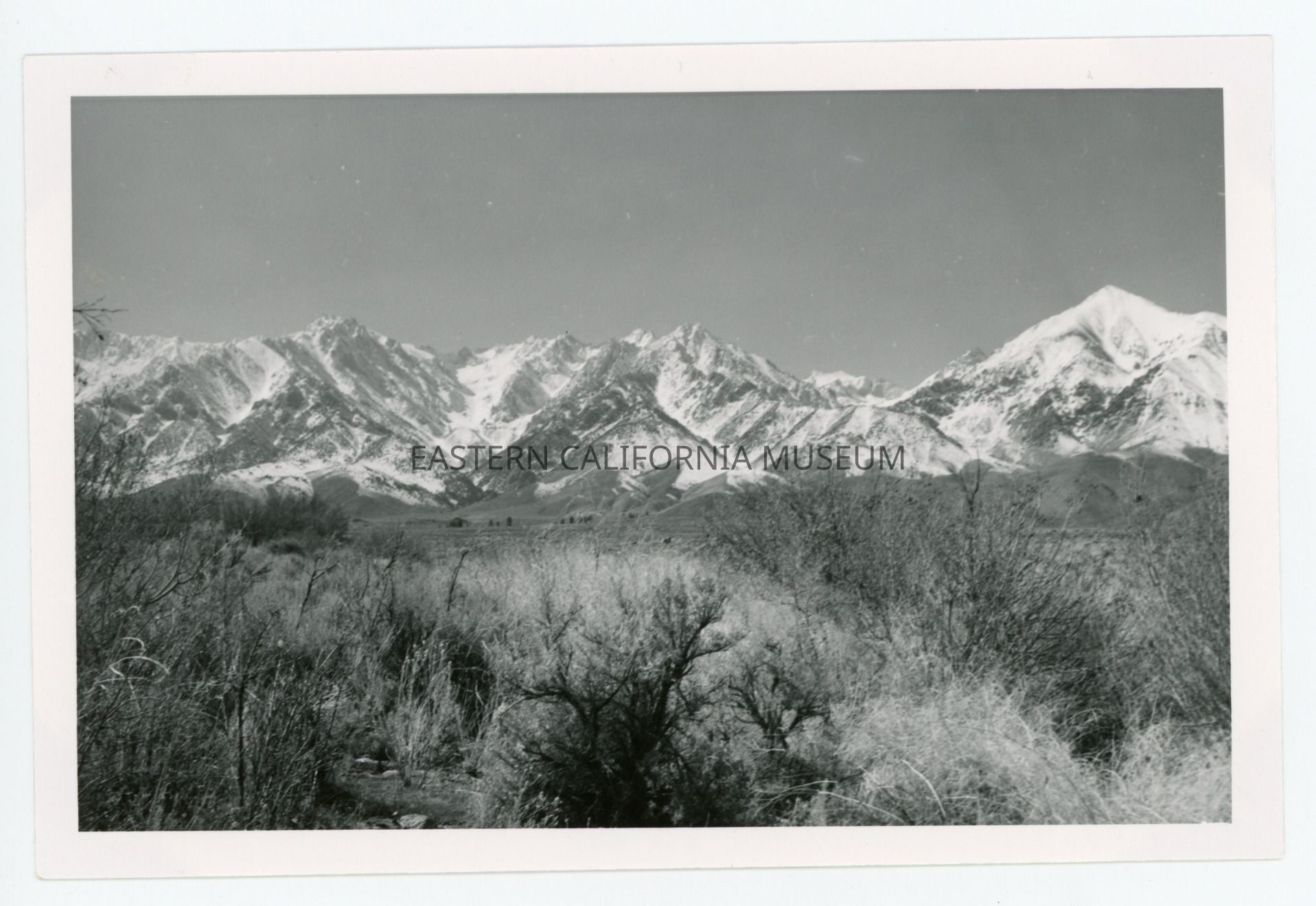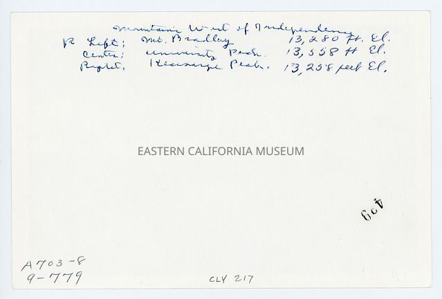 Handwritten in blue ink on reverse: Mountains west of Independence. Left: Mt. Bradley [13,280 ft. el]. Center: University Peak [13,558 ft. el.]. Right: Kearsarge Peak [13,258 feet el.].Collection