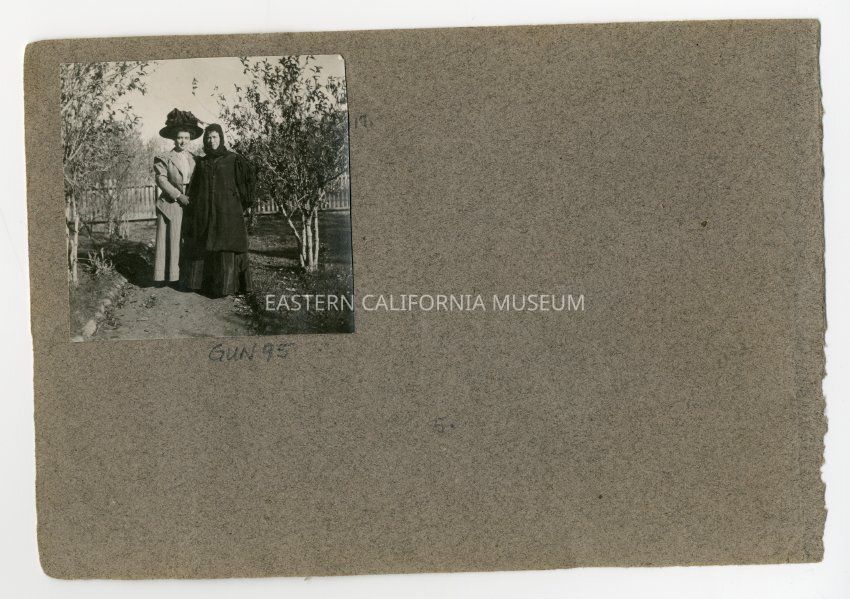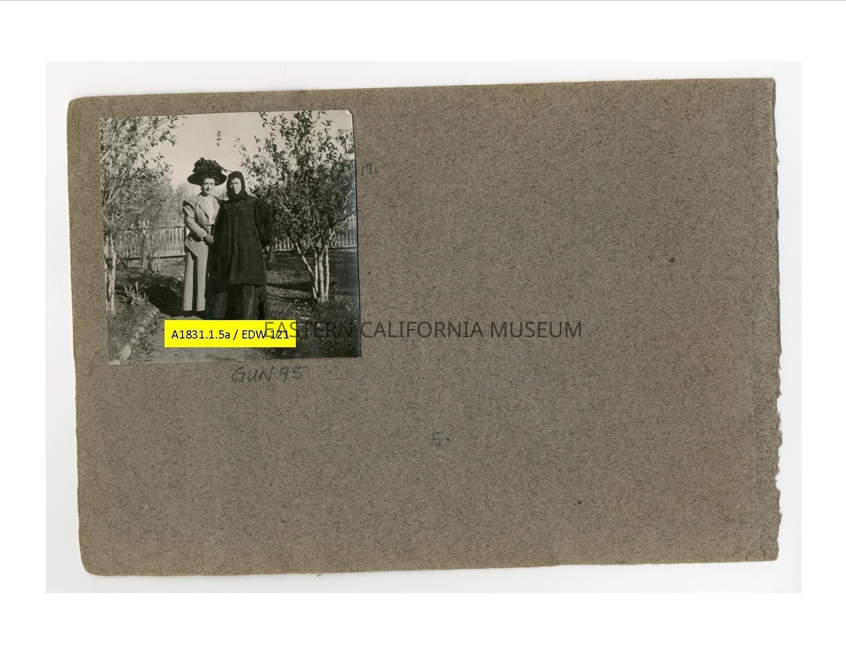 A1831.1.6a: Photo of two women standing on a dirt pathway in someone's yard. Woman on left has large, elaborate hat while the woman on right is wearing all black. The younger woman is identified as Helen Gunn and the location is at the Hannah House in Independence.Collection