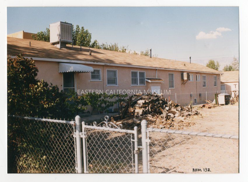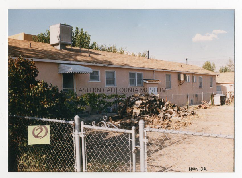 Color photograph of 420-422-424 Jackson Street, a building moved to Independence from Manzanar after the closure of the site. There is a yellow label with the number 2 in a circle on the front of the photo.Photograph Details