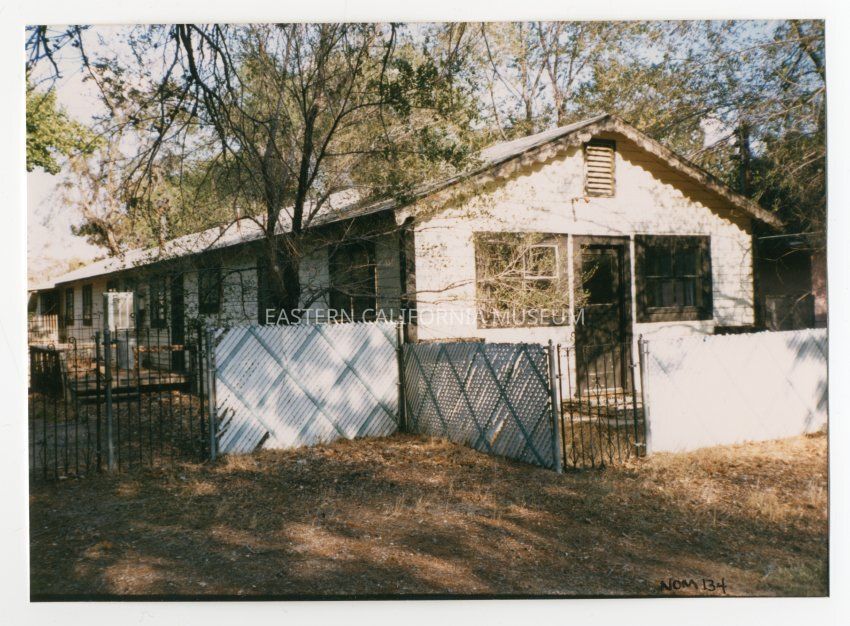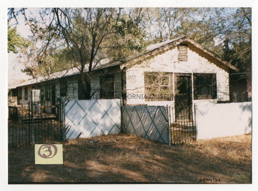 Color photograph of beige building in the 500 block of N. Edwards Street, Independence. On the front of the photo on a yellow label is the number 3, referring to a map of locations of buildings that were moved to Independence after the closure of Manzanar.Photograph Details