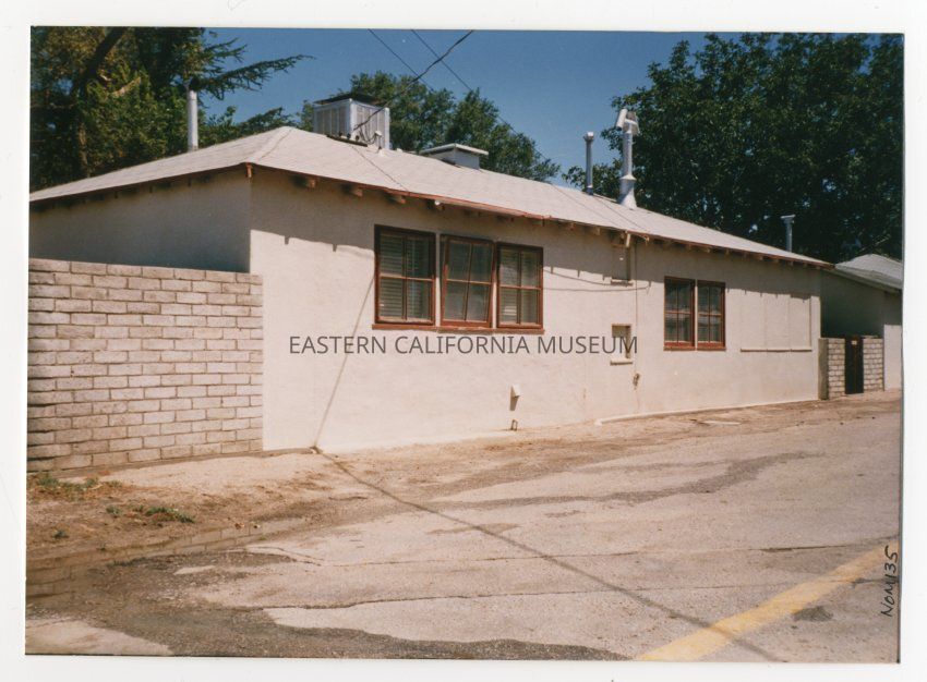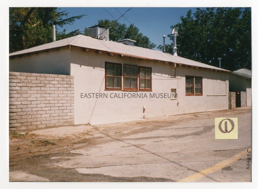 Color photograph of the back side of a beige building at 101 Valley View in Independence with a yellow label with "1" in a circle on it that refers to a map that shows this building was relocated to Independence from Manzanar after the site closed.Photograph Details