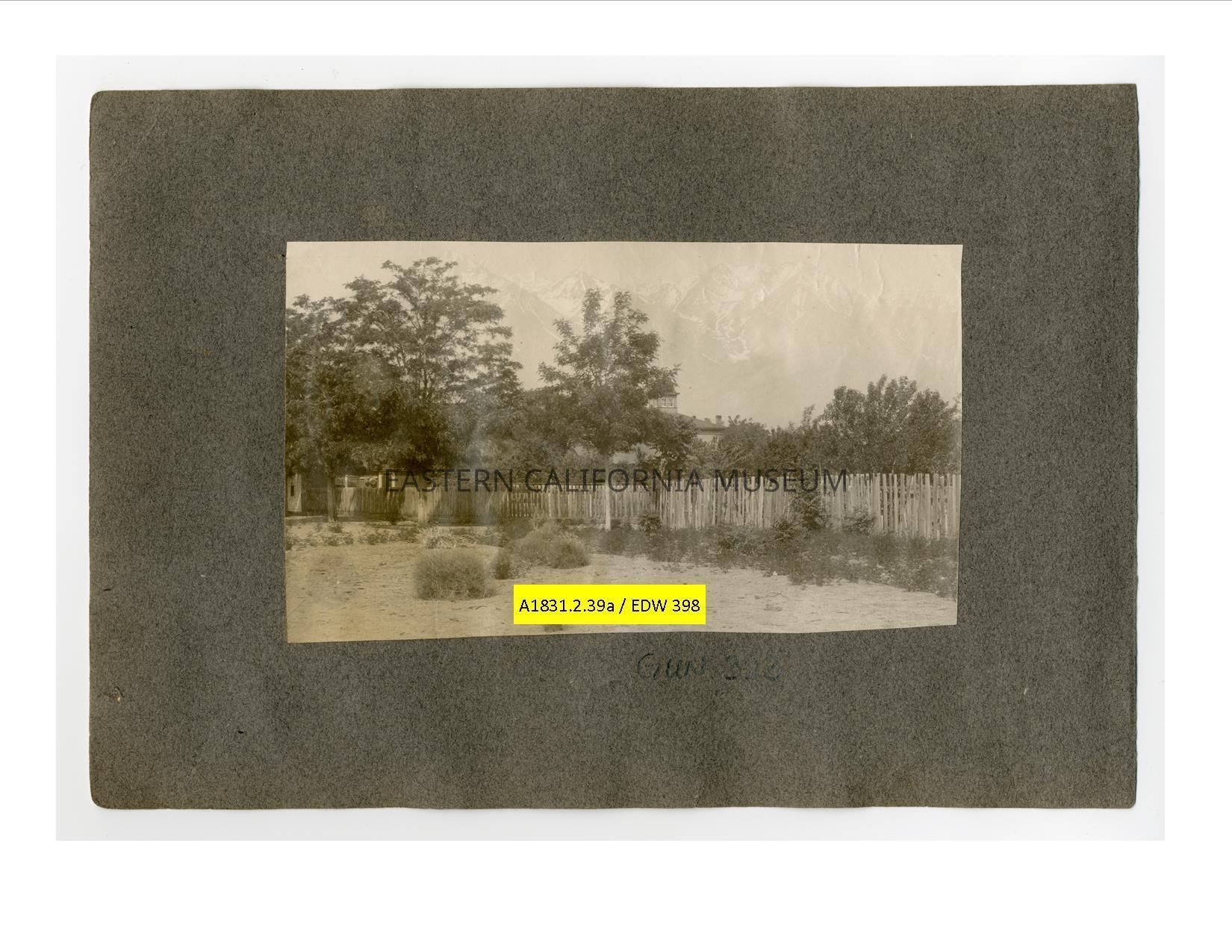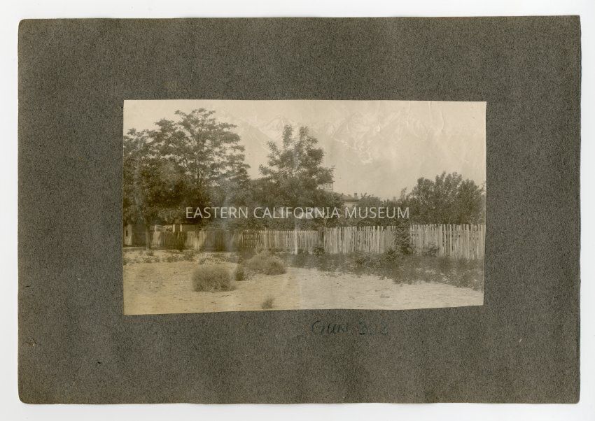 A1831.2.39a: Long photo looking west toward Sierra Nevada mountain range from the town of Independence. The cupola of the Inyo County Courthouse (third) is visible behind a tree. Fence and bushes in foreground.Collection
