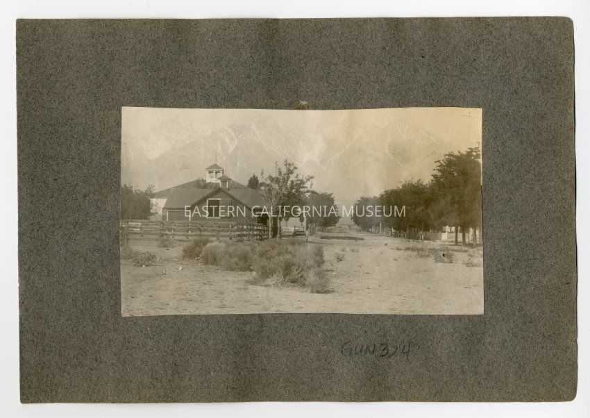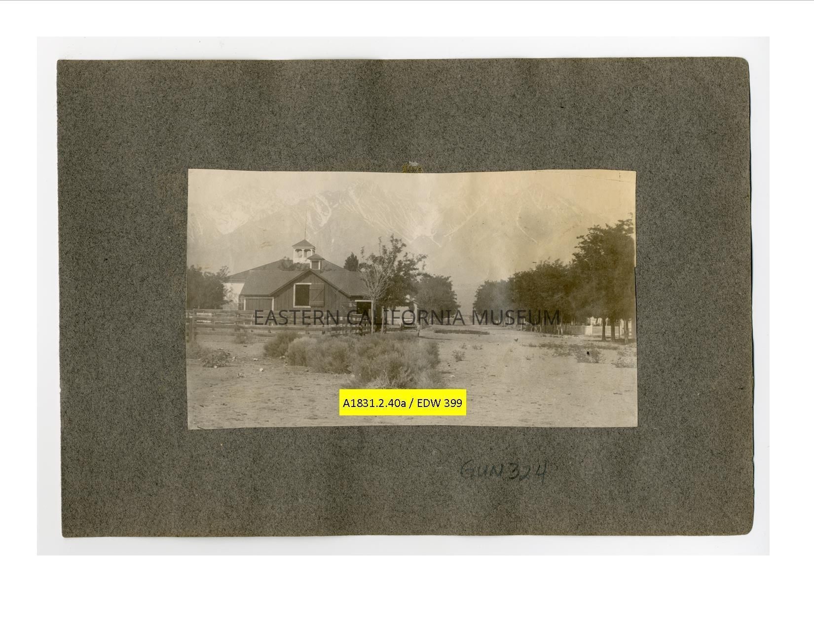 A1831.2.40a: Long photo looking west toward Sierra Nevada mountain range from the town of Independence. The building is identified as the Pavilion building, and the photo was taken looking west up Market St.Collection