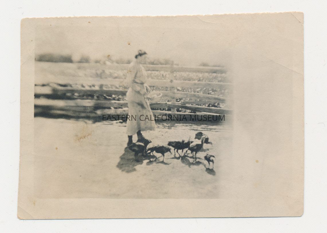 Written in pencil on reverse: Ora with turkeys, Mairs Ranch. Ora Drew, Mairs Ranch, Independence, CA, about 1918.Photograph Details