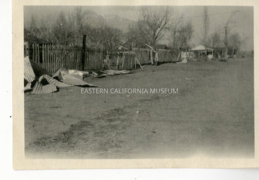 Photo of damage done to fences along a street and the debris. This is likely after the wind storm of 1923.