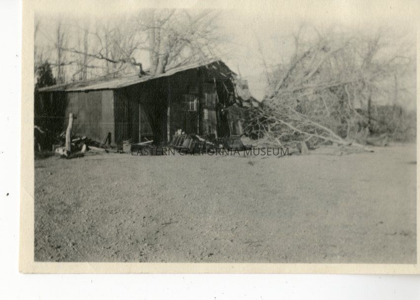 Photo of downed trees/branches and damage done to a structure. Likely after the 1923 wind storm.