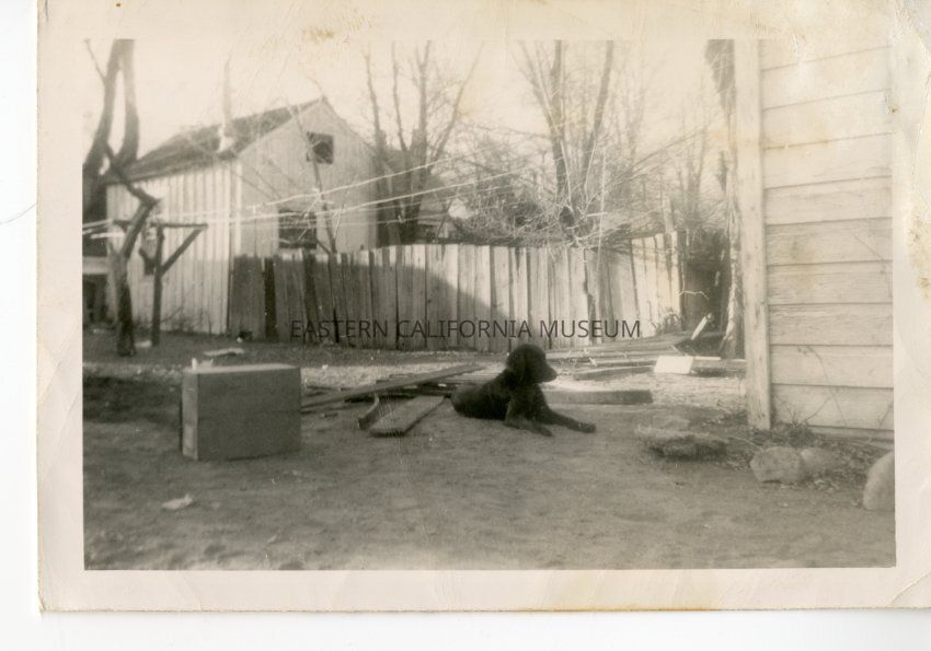 Handwritten in black ink on reverse: Circa 1944. Lucky. Backyard of the house in Independence, CA.Photograph Details
