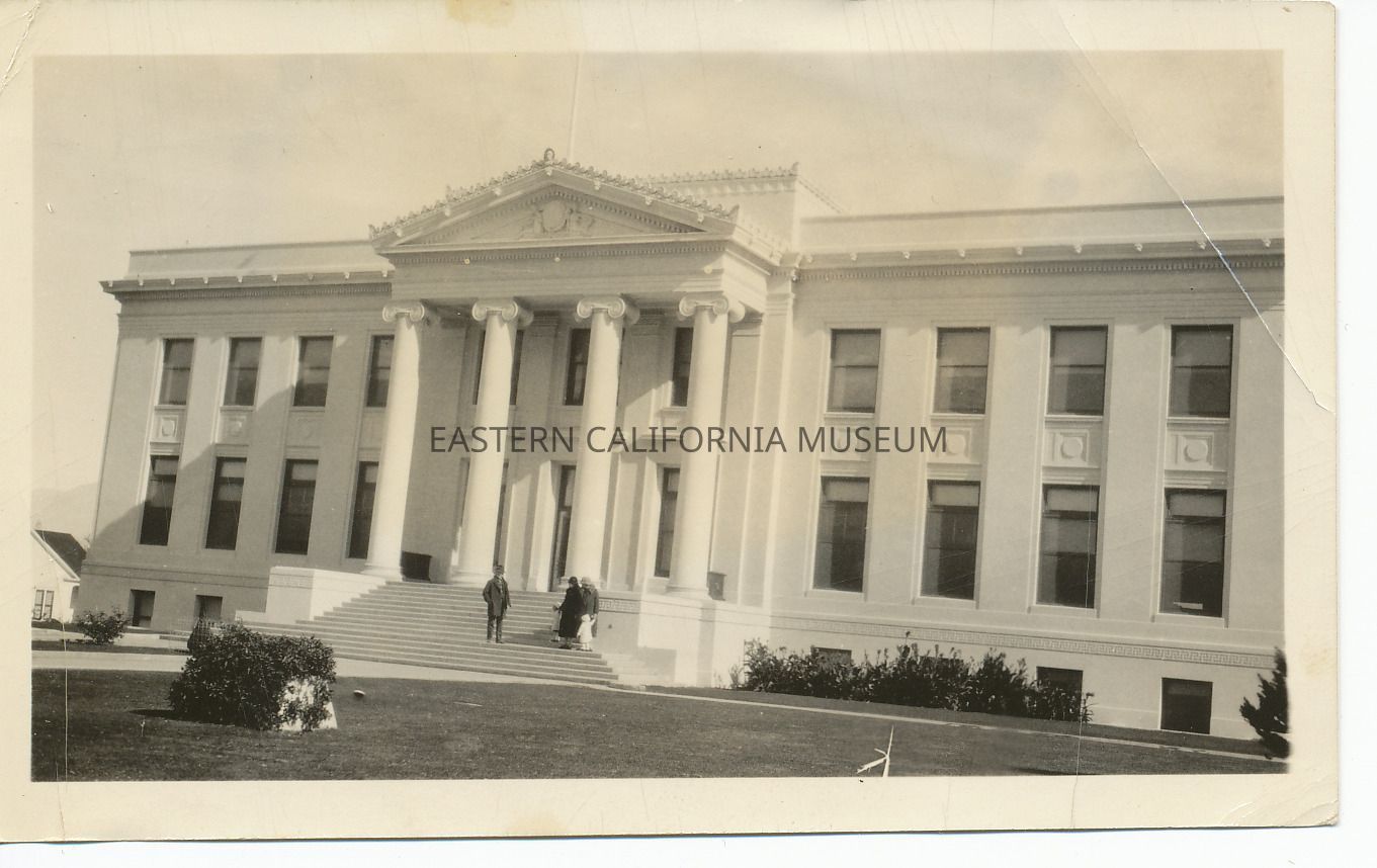 Small photo of the Inyo County Courthouse (4th) in Independence. There are four people (one is a toddler) standing on the steps.