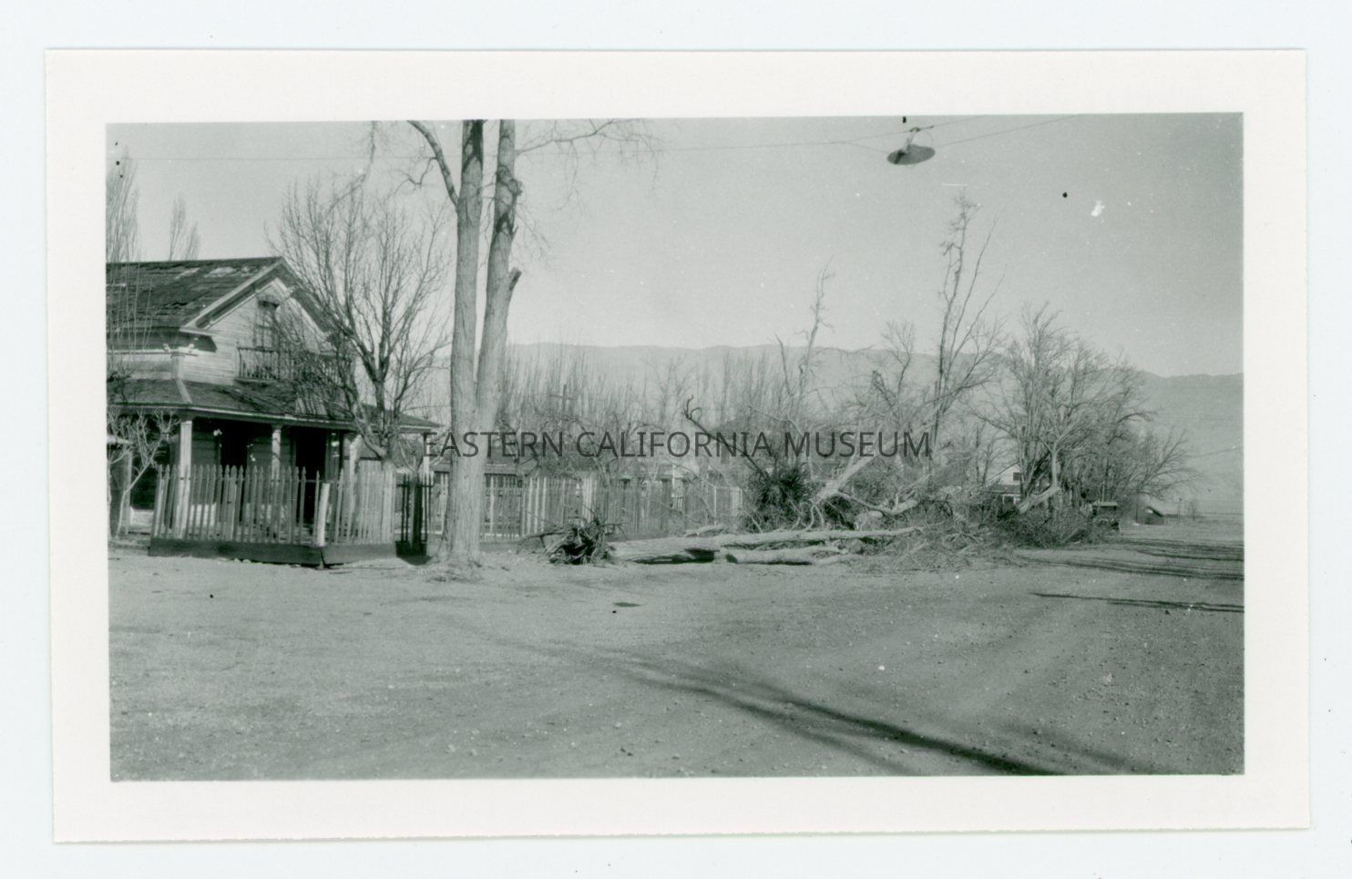 Copy of a photo of downed trees along a residential street (house and fence). It is likely the aftermath of a wind storm. Photo taken looking east towards the Inyo Mountains.