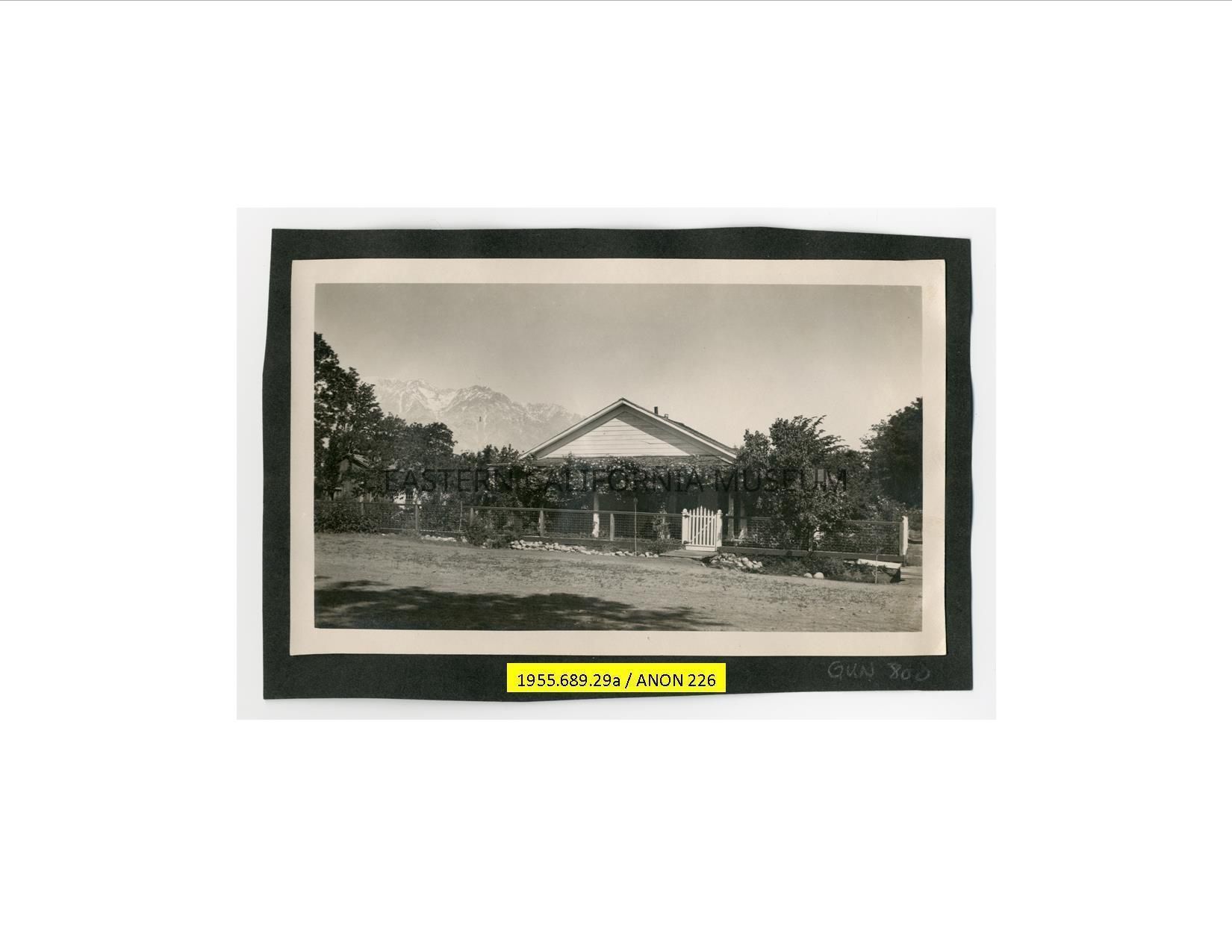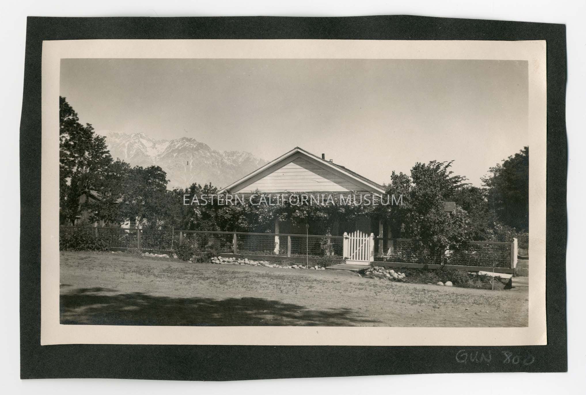 Photo of a house with Sierra Nevada mountain range in background. It has been identified as the Dehy house in Independence.Photograph Details