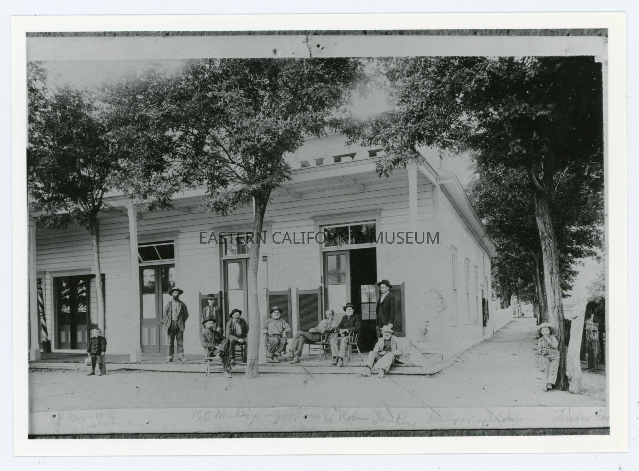 Written on reverse: Left to right: Harry J., unknown, unknown, Pete M. [Mairs?] (chair on ground), Boyd (chair on porch), Joe, E. [Elijah?] Robinson, Jim Rise, Hillyer (sitting), J. C. Ivers [McIver?] (standing in suit), Tucker boy (leaning on tree). "Old Corner" Saloon (SW corner of Market and 395).Photograph Details