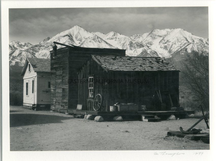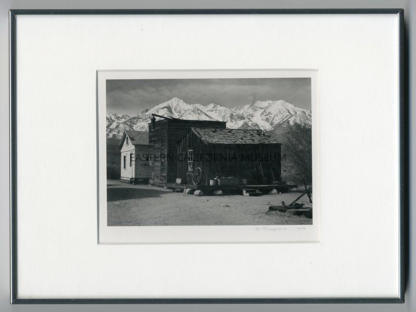Framed and matted photo of the Little Pine Village on the grounds of the Eastern California Museum. Taken by Gene Thompson in 1979. It shows the Community Hall utility shed (Pete Maris building), Brewery office, and Gunn kitchen building with the snow-capped Sierra Nevada in the background.Made/Created