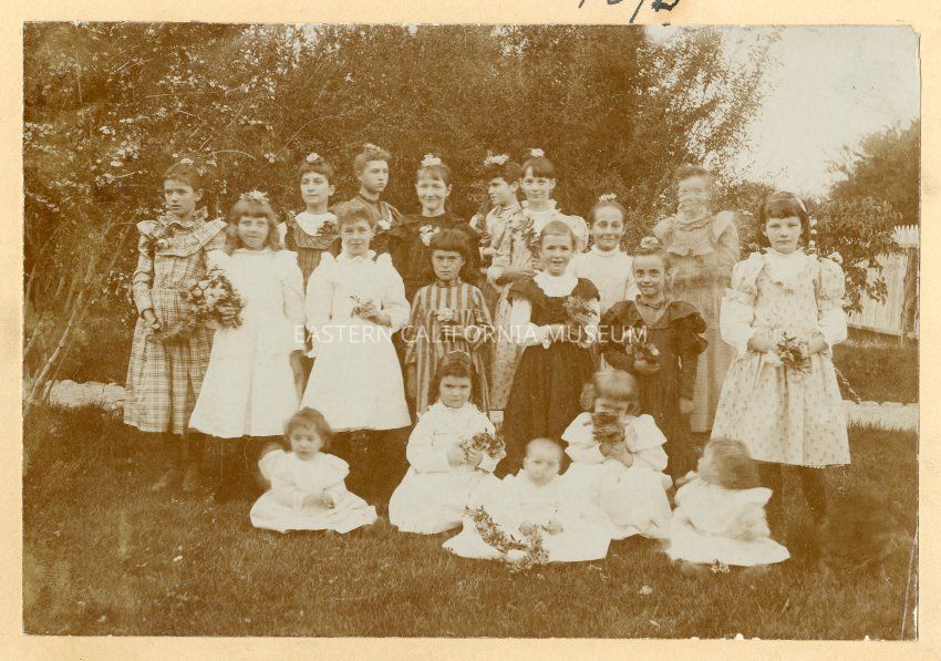 Old label says: Helen Gunn's birthday party 1895. First row (LtoR standing): Minnie Levy Mairs, Jennie Baxter Harper, Edna Matlack Krater, Birdie Levy Yandell, Estell Robinson Calloway. Second row (LtR standing): Blanche Bunney Garrett, Nettie Irwin, Irma Webb, Lena Levy, Maggie Bunney Tucker, Rita Church Ward, Hattie Moore. Seated (LtoR): Irving Joseph, Hazel Bunney, Fay Bunney (baby), Helen Gunn, Walter Levy. Independence.Collection
