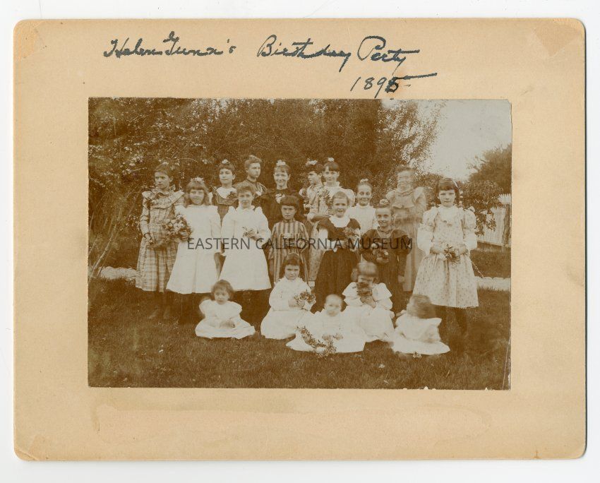 Mounted photograph labeled "Helen Gunn's Birthday Party 1895" in Independence. Attendees included Minnie Levy Mairs, Jennie Baxter Harper, Edna Matlack Krater, Birdie Levy Yandell, Estella Robinson Calloway, Blanche Bunney Garrett, Nettie Irwin, Irma Webb, Lena Levy, Maggie Bunney Tucker, Rita Church Ward, Hattie Moore, Irving Joseph, Hazel Bunney, Fay Bunney (baby), Helen Gunn, and Walter Levy.