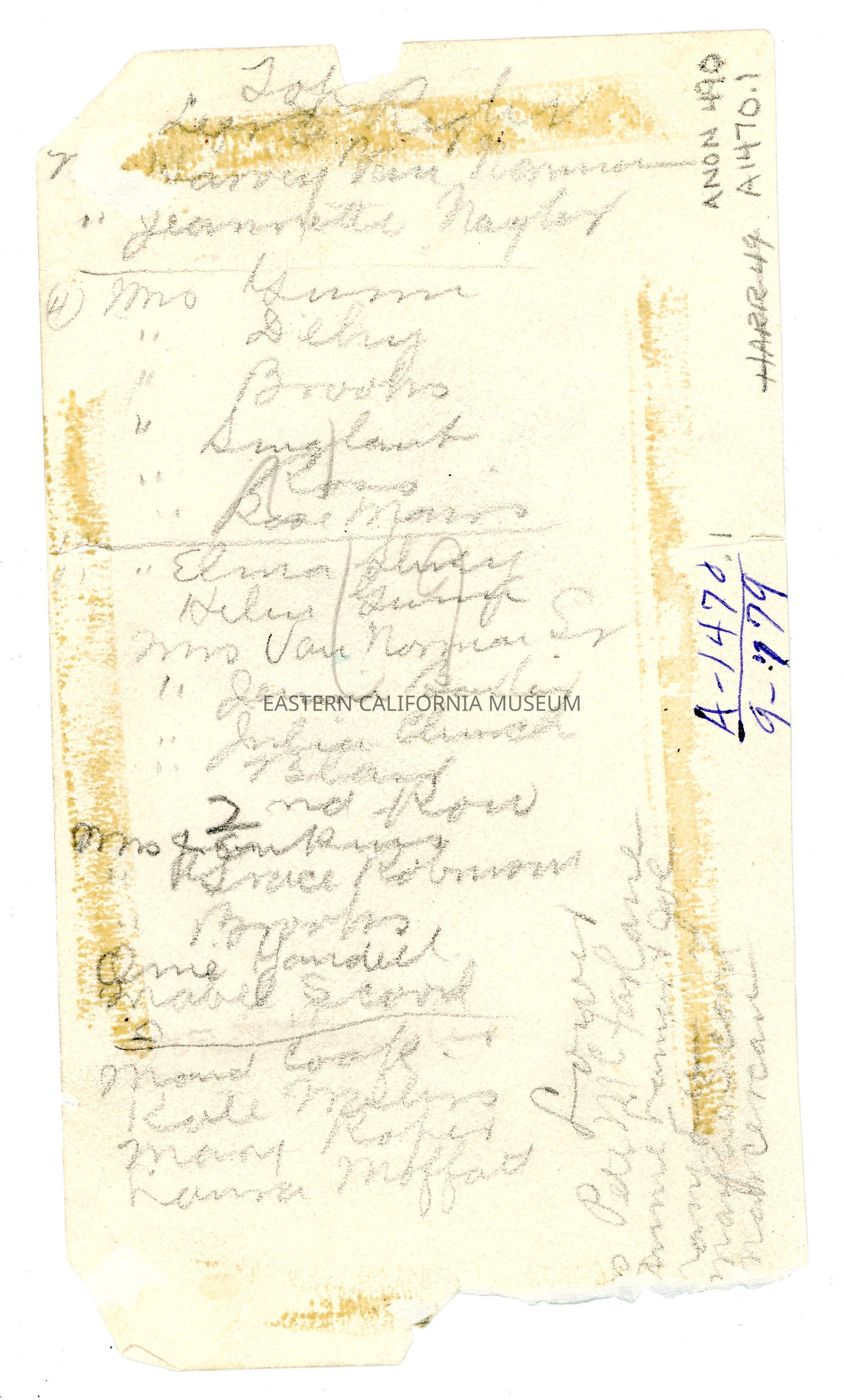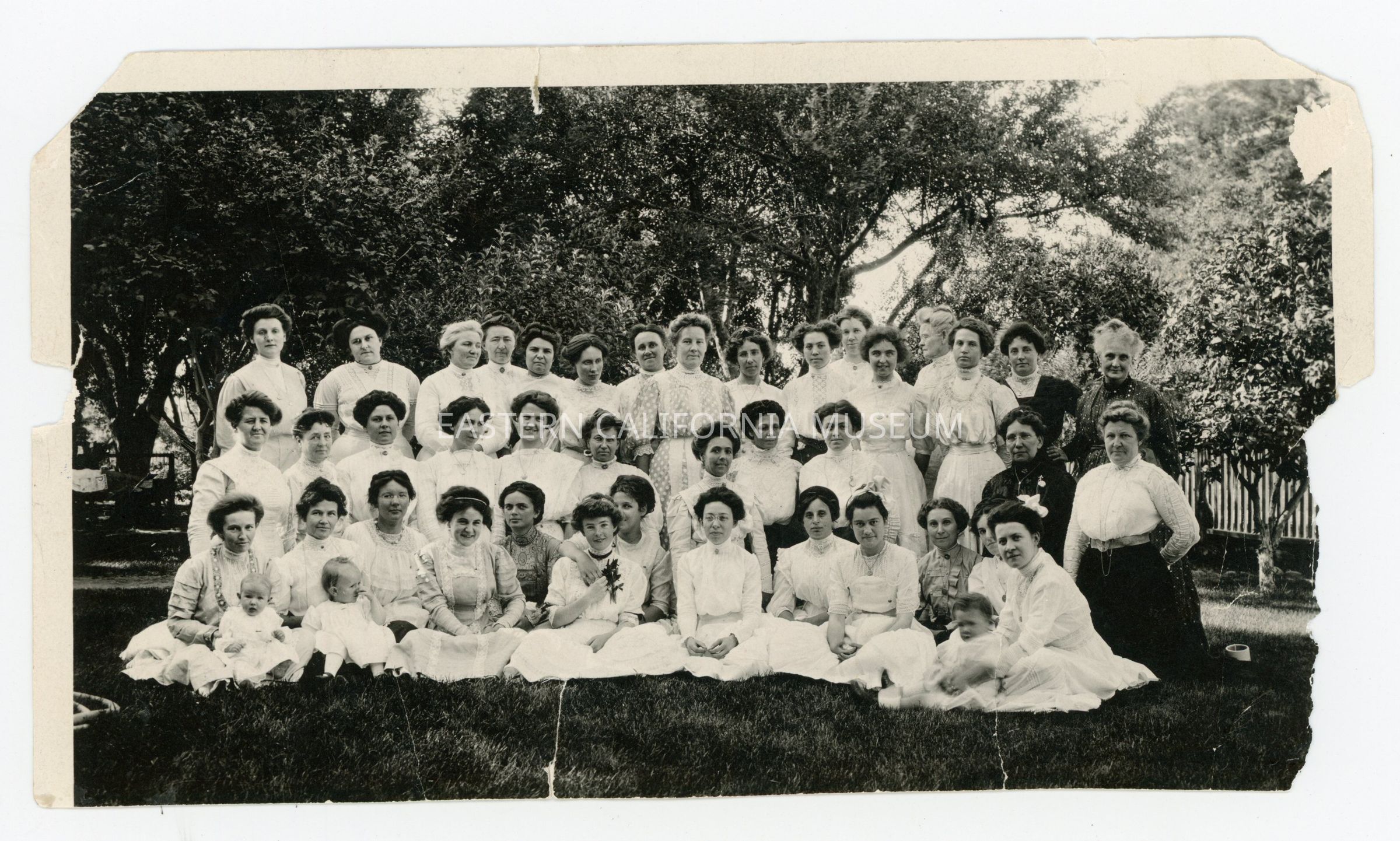 Small photo of a large group of women who attended a lawn party thrown by Mrs. Van Norman on 06/30/1912. Nearly all of them are wearing white dresses, and a few have babies with them. They are identified on the back.Made/Created