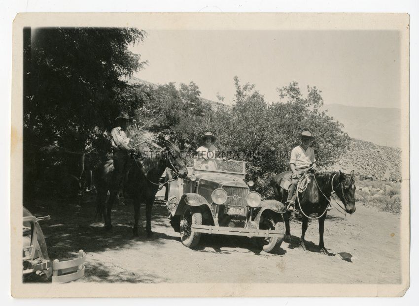 Frank Chrysler on horseback, unidentified horseman, and a car with an unidentified woman in it.