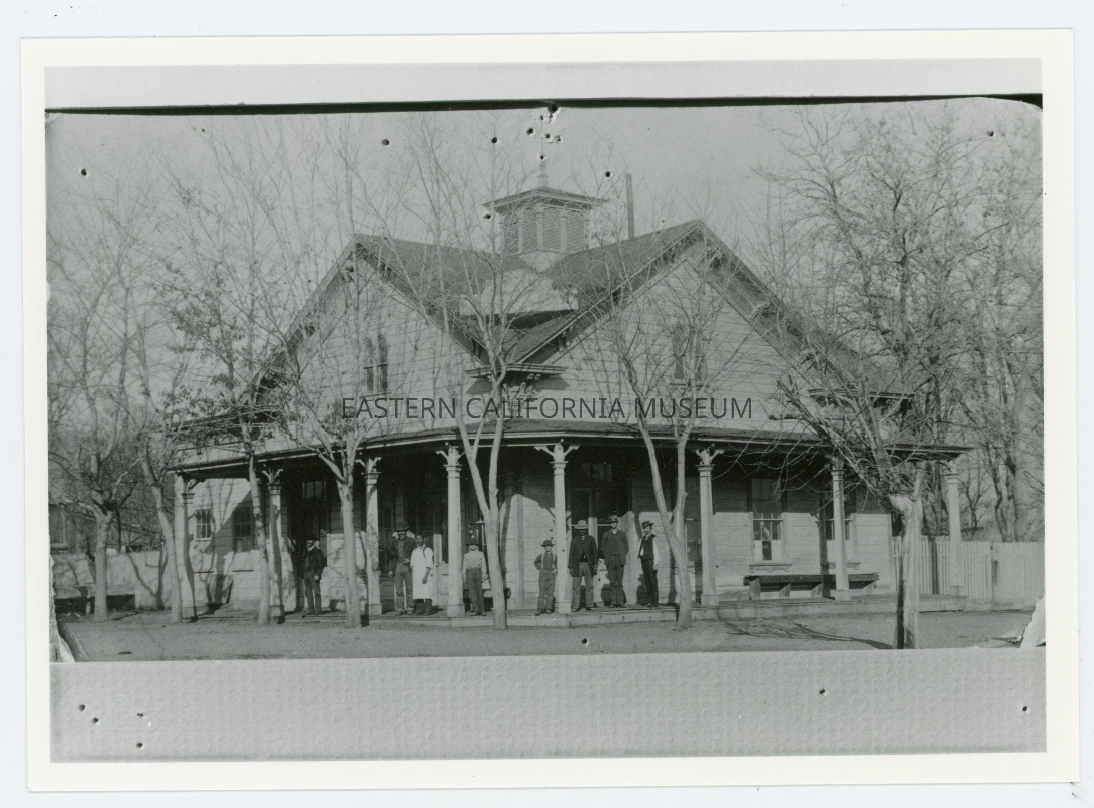 Copy of a photo of a building surrounded with young trees. There are eight people (men and boys) standing on the porch, one of whom appears to be wearing a long white apron. It has been identified as the brewery building in Independence.