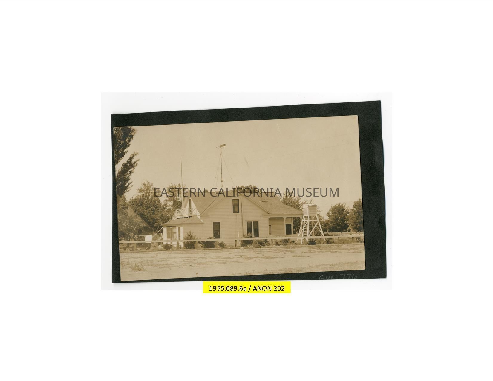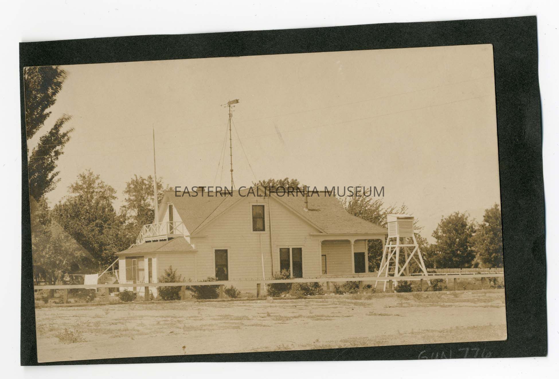 Photo of a two story building with a tall pole or tower on the roof. It is identified as the Weather Station in Independence on Jackson Street. There is a raised box structure (possible weather measuring equipment?) beside the house.Photograph Details
