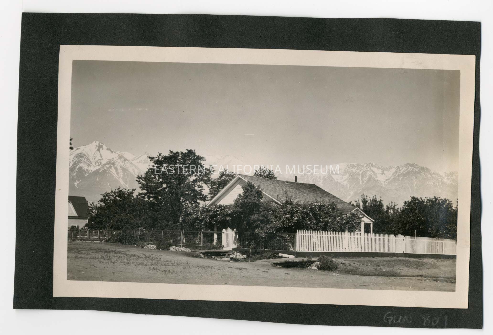Photo of a house with a white picket fence and the Sierra Nevada mountain range in the background. It has been identified as the Dehy house in Independence.Photograph Details