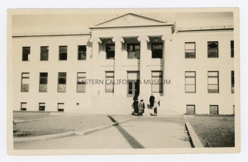 Photo of the fourth Inyo County Courthouse with little to no landscaping in front. There is a group of people going up the steps.Collection