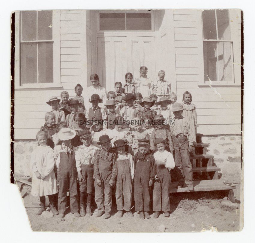 School or class photo, likely at Big Pine (based on the building). Mostly young, elementary-aged children. No teachers or high schoolers.They are standing on wooden stairs in front of double doors with a glass transom.