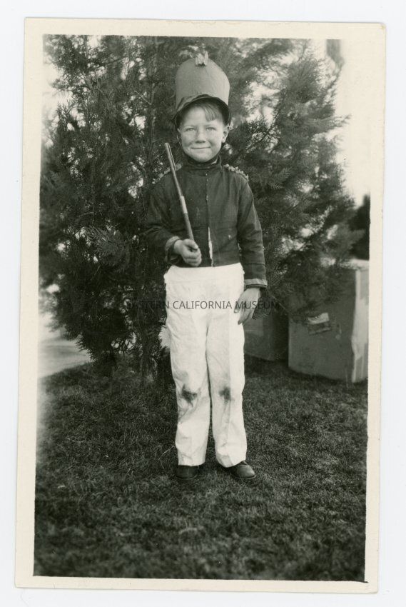 Photo postcard of a young boy standing outside in front of tree. He appears to be in some costume (drummer boy?) and holding a long stick (baton?) in his right hand. He is identified on reverse as Ed Barnes, Big Pine, c. 1930.Collection