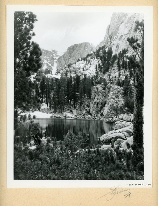 Black and white photo of a lake with mountains and trees surrounding it. Two men are visible near the water's edge. Stamped with "Skinner Photo Arts" in the lower right corner, also autographed in pencil "Skinner LA".