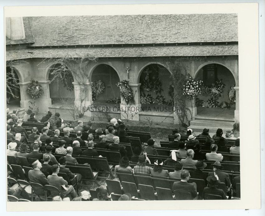 Black and white photo of the funeral service for Father Crowley at Santa Rosa Church in Lone Pine in March 1940.