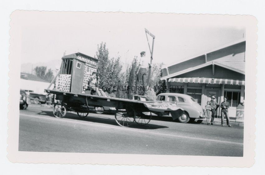 Photo of a parade float with a jail ("Senior Jug") and gallows. On the other side of the street is a family (man, woman, daughter) standing in front of the Chamber of Commerce building. The edges of the print are scalloped.