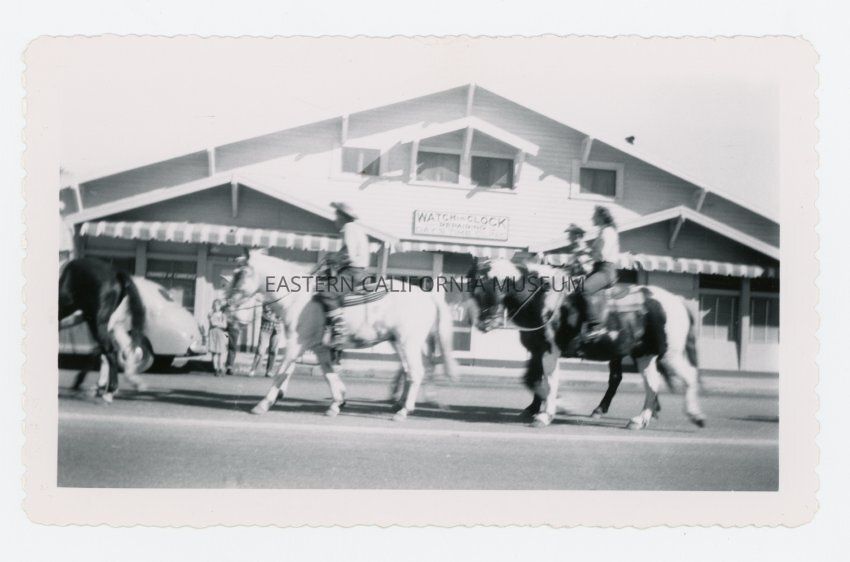 Photo of horseback riders in a parade. On the other side of the street is a watch and clock repair shop. The Chamber of Commerce is on the left. The edges of the print are scalloped.