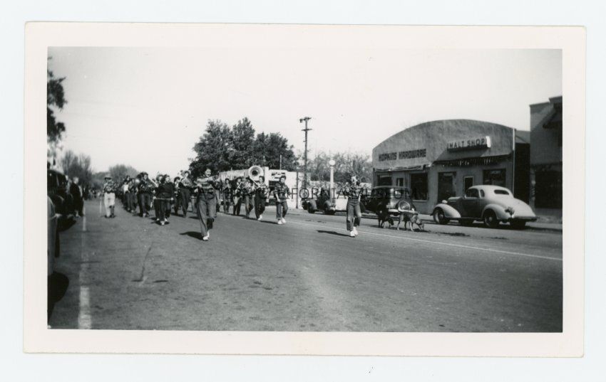 Photo of a marching band in a parade. On the other side of the street is Hopkins Hardware store and a malt shop.