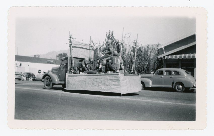 Photo of a parade float decorated like a football field with goalpoasts and players in uniform. The sign on the side says, "It's in the bag." The print has scalloped edges.