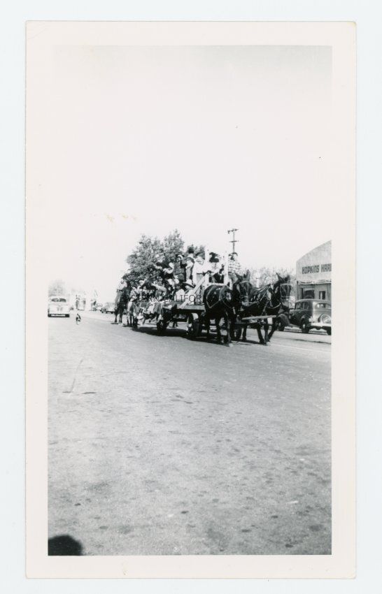Photo of a horse-drawn float in a parade. On the other side of the street is Hopkins Hardware store.