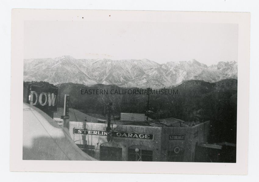 Photo taken from the roof of the Dow Hotel in Lone Pine looking west over Sterling Garage towards the snow covered Sierra Nevada mountain range.