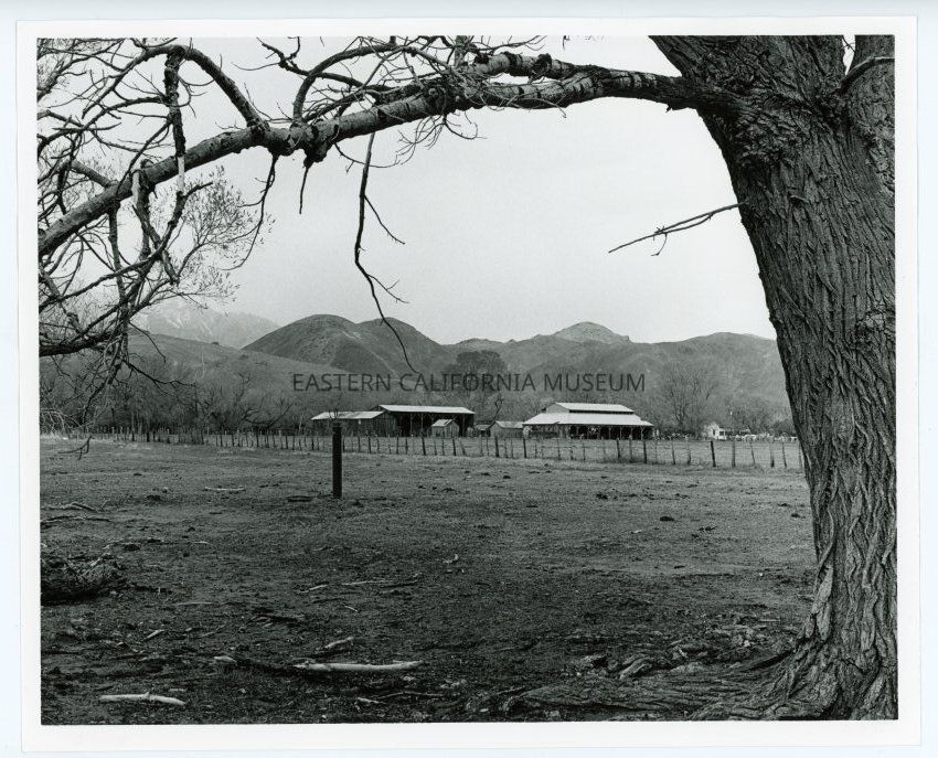 Photo of a ranch near the Alabama Hills outside of Lone Pine, C. The letters "LP" are visible on the hillside in the background. Tree in the foreground framing the shot. Photo take by Les Larson.Collection