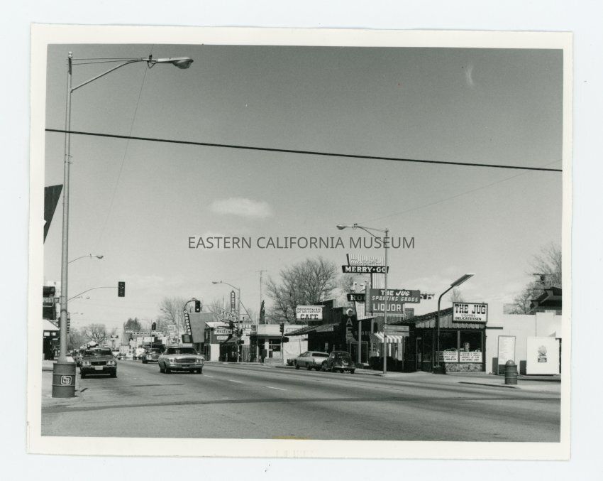 Photo of Lone Pine Main Street (Highway 395) looking north from the corner of Post Street. Several businesses are visible, including The Jug, the Merry-Go-Round, Sportsman Cafe, and some sporting goods, hardware, and liquor stores. Photo taken by Les Larson.Collection