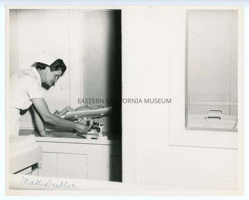 Photo of the interior of the Mt. Whitney Hospital in Lone Pine showing a nurse weighing a baby. Written in blue ink in lower left corner is, "Mattie Butler."Collection
