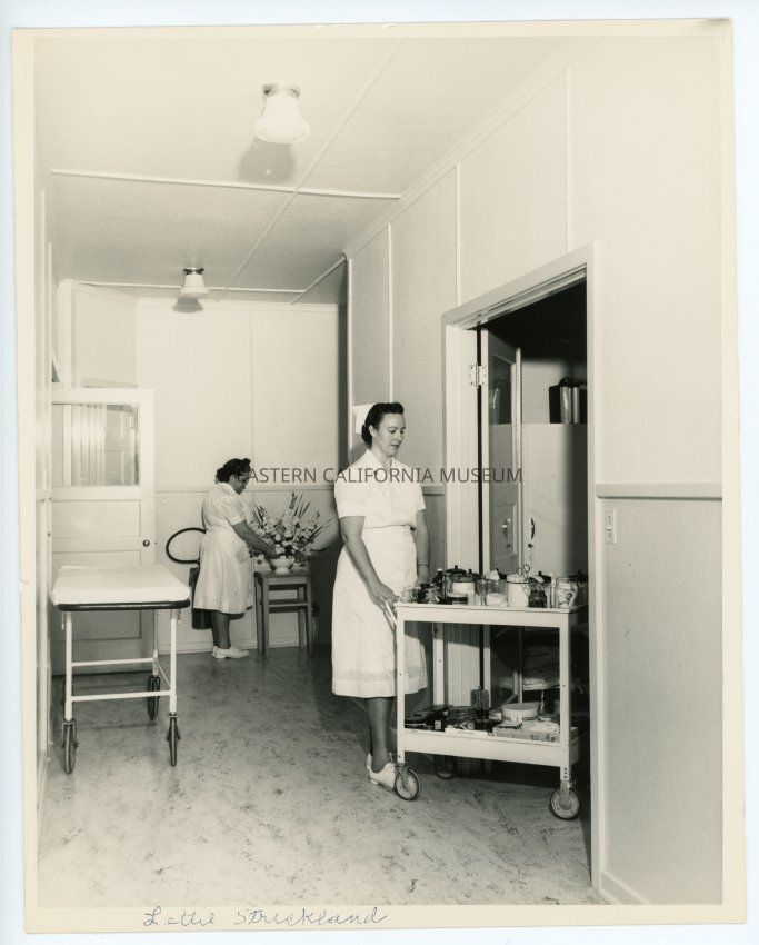 Photo of the interior of the Mt. Whitney Hospital in Lone Pine showing a two female employees at work. Written in blue ink below the image is, "Lettie Strickland."Collection