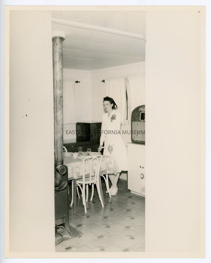 Photo of the interior of the Mt. Whitney Hospital in Lone Pine showing a female employee (nurse?) standing by a dining table.Collection