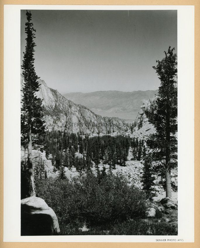 Black and white photo of what may be the view down Lone Pine Canyon, based on the location of the other photos in this album. Taken in the Sierra Nevada looking east toward the Inyo Mountain range. Stamped with "Skinner Photo Arts" in the lower right corner.