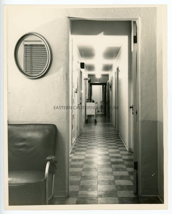 Photo of a hallway in either the offices of the Southern Inyo Medical Group, consisting of Dr. George D. Shultz and Dr. William. E Gullett, or the Mt. Whitney Hospital in Lone Pine.Collection