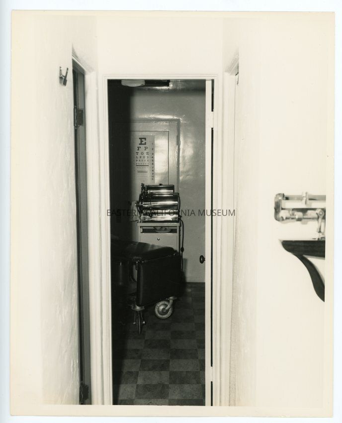 Photo of an eye chart and other equipment in either the offices of the Southern Inyo Medical Group, consisting of Dr. George D. Shultz and Dr. William. E Gullett, or the Mt. Whitney Hospital in Lone Pine.Collection